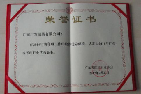近日,廣東廣發(fā)制藥有限公司榮獲了“2016年廣東省醫藥行業(yè)優(yōu)秀企業(yè)”稱(chēng)號,此外公司執行董事夏羽同志也被評為“2016年廣東省醫藥行業(yè)優(yōu)秀企業(yè)家”。
