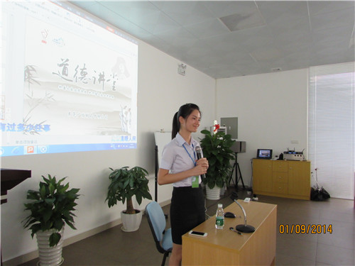 ? ? ? 9月1日下午,“道德講堂”在東莞廣發(fā)制藥多功能廳舉行,由主持人馮淑君帶大家走進(jìn)本期道德講堂。大家對自己的工作“做反省”之后,主持人帶著(zhù)大家“唱一首歌”。